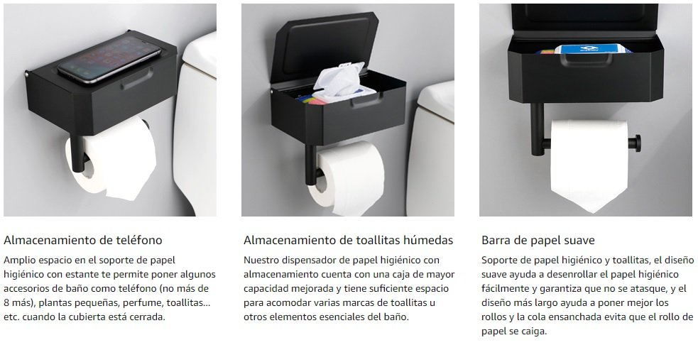 - Mantén tu baño ordenado y organizado con nuestro soporte de papel higiénico negro, que incluye un dispensador de toallitas impermeables y un estante de almacenamiento para mayor comodidad.